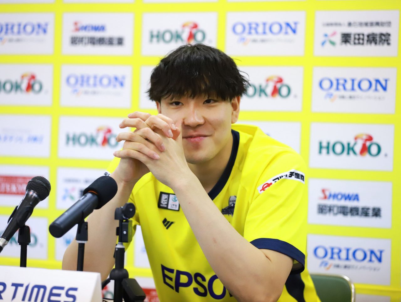 第1戦後の記者会見、そこには悔しさを滲ませた狩野の姿があった。10分18秒の出場で6得点1リバウンド、4ファウル。138㎏の巨体を誇るスミスを中心とした福岡のビッグマン勢に対抗できず、ペイント内の得点では信州の34得点に対し、福岡には54得点を献上。リバウンドやディフェンスでも力負けするシーンが目立った。