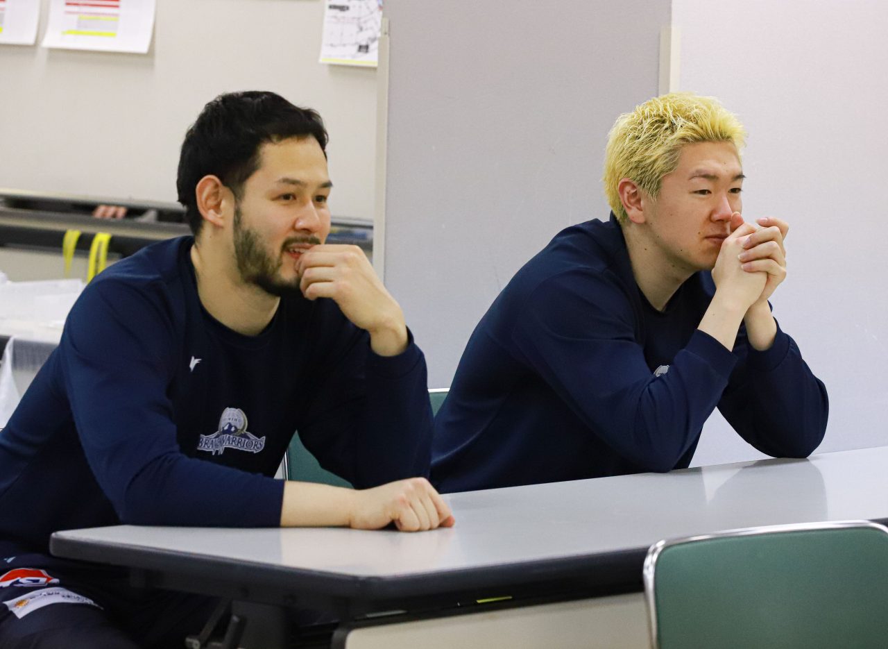会見の途中、なにやら狩野が会見場の後ろを気にしていたので確認をすると、そこには小玉大智と山崎玲緒の姿があった。試合中でも、狩野のプレーに喜びを爆発させていた2人だ。実はこの2人、第1戦終了後に狩野のリバウンド練習に付き合っていたという。