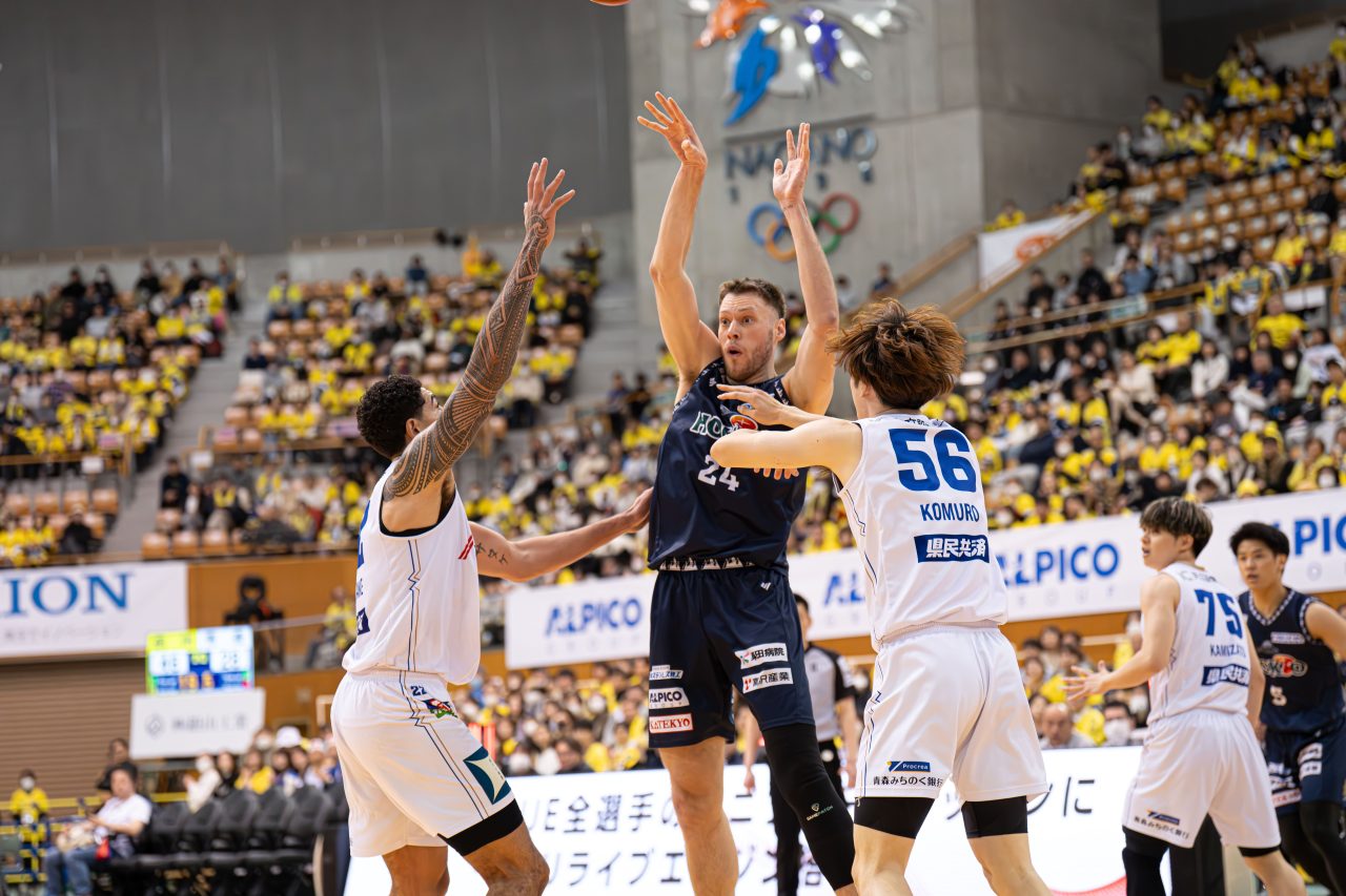 ディフェンス面でも徐々に存在感を見せている。信州の複雑なシステムに苦心する場面はあるものの、プレスディフェンスやゾーンディフェンスではトップの位置からプレッシャーをしかけ、221センチともいわれる長いウイングスパンを生かした好守を披露。リーグベストのディフェンシブレーティングを誇る信州の中でも、重要な役割を担っている。